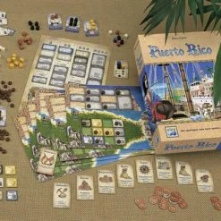Dit is het Ravensburger bordspel Puerto Rico. In 1493 ontdekt Columbus Puerto Rico, de parel van het Caribische gebied. En al een goede halve eeuw later beleeft het eiland haar eerste grote bloeiperiode. De spelers kruipen tijdens het spel steeds weer in een andere rol. Als kolonist leggen ze vruchtbare plantages aan. Als opzichter produceren ze waardevolle goederen, die ze dan, in de rol van handelaar, met de hoogst mogelijke winst verkopen. Dat verdiende geld gebruiken ze dan weer om als bouwmeester indrukwekkende stadsgebouwen op te richten.
