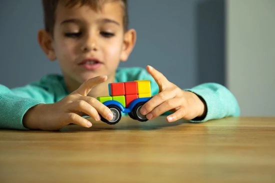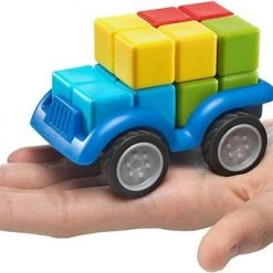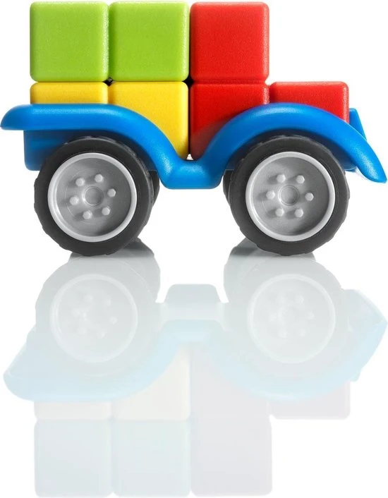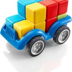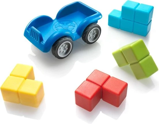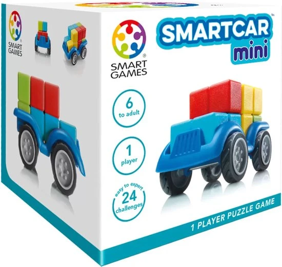 Kan jij een auto volgens plan in elkaar zetten? Plaats de 4 blokken op de juiste plaats en maak een testritje met je auto. SmartCar Mini is een leuke, compacte 3D-puzzel met 24 opdrachten. Spelregels Kies een opdracht en plaats alle blokken naast het chassis. Gebruik de 4 blokken om een auto te bouwen, waarbij de kleuren overeenkomen met de opdracht. Witte vierkantjes betekenen dat je de kleur van die puzzelstukken niet kent. Gebruikt deductie en logica om te ontdekken welke kleuren daar passen. Starter-opdrachten tonen een volledig zijaanzicht. Junior-opdrachten tonen een onvolledig zijaanzicht (met een aantal witte vierkantjes) Expert-opdrachten tonen een onvolledig voor-, zij- en bovenaanzich. Master-opdrachten tonen een onvolledig voor- en achteraanzicht. Er is maar 1 oplossing, die je in het boekje kan terugvinden. Inhoud: 1 auto met 4 wielen, 4 blokken in 4 verschillende kleuren, 1 boekje met 24 opdrachten.