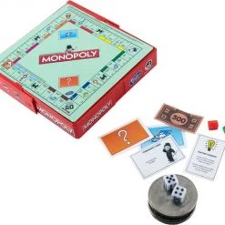 Inhoud voor volop speelplezier: dobbelstenen, lopers, huizen, hotels, kaarten, geld, spelbord en opbergdoos in zakformaat.
