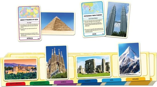Maak een reis om de wereld en leer heel veel over de grootste wonderen op deze planeet! Van de Grand Canyon tot de Kilimanjaro en van de Sint Pietersbasiliek tot de Taj Mahal! Wij verzamelden de 195 indrukwekkendste en fraaiste wonderen van deze planeet. Maak een wereldreis en leer heel veel over deze grootste Wonderen van de Wereld. Probeer de wonderen op de kaarten te benoemen, leer waar je ze kunt vinden of waarvoor ze gebruikt worden. Als je het goed hebt, scoor je punten. En wie de meeste punten scoort, wint het spel. Word al spelend wijzer en verbaas je met je medespelers over de wereld vol bijzondere wonderen.