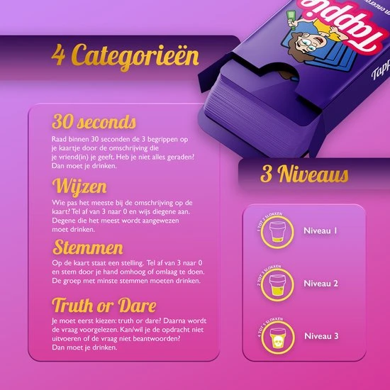 Een onvergetelijke avond met het TAPPIE drankspel! Benieuwd naar wat vrienden of familie voor keuzes maken tijdens het kaartspel? Op zoek naar een fantastische gesprekstarter of achter sappige geheimen komen? Dan is Tappie h?t drankspel die jij in huis moet hebben! Het kaartspel kent 4 verschillende categorie?n: 30 seconds, truth or dare, wijzen en stemmen. Bij elke categorie is er ??n spelmeester die het spel leidt. Verder bepaald het icoon rechts onderop de kaart hoeveel slokken een speler of team moet drinken.