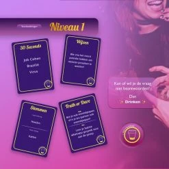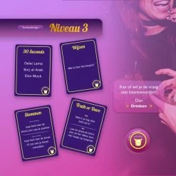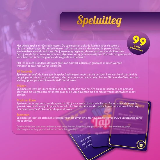 De spelmeester geeft een kaart aan de speler. De spelmeester moet aan de persoon link van hem de 3 begrippen op de kaart omschrijven zodat de ander het kan raden binnen 30 seconden. Worden niet alle begrippen geraden binnen de tijd? Dan zul je moeten drinken!
