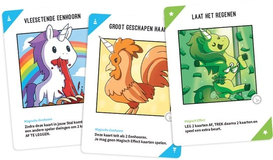 Probeer als eerste speler 7 eenhoornkaarten in jouw ‘stal’ (voor je op tafel) te verzamelen. Iedere speler begint