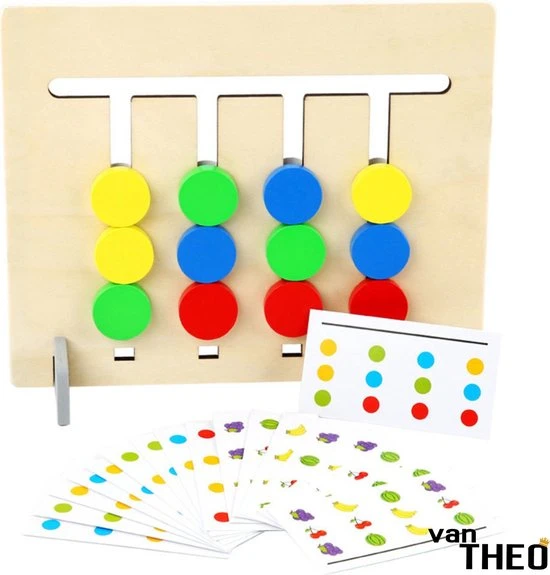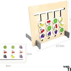 Het schuifspel is gemaakt van hout en heeft twee zijden, een kant met fruit en de andere kant met kleuren, en 36 verschillende opdrachtkaartjes. De schuifknoppen zijn zo gemaakt dat ze niet uit het houten frame vallen. Het bijgeleverde houten standaardje zorgt ervoor dat je het spel gemakkelijk op tafel kan spelen, maar met de hand vasthouden kan ook.